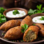 Knusprig frittierte Bulgur-Kroketten, gefüllt mit gewürztem Hackfleisch, Zwiebeln und Walnüssen, serviert mit Brot und hausgemachtem Dip.